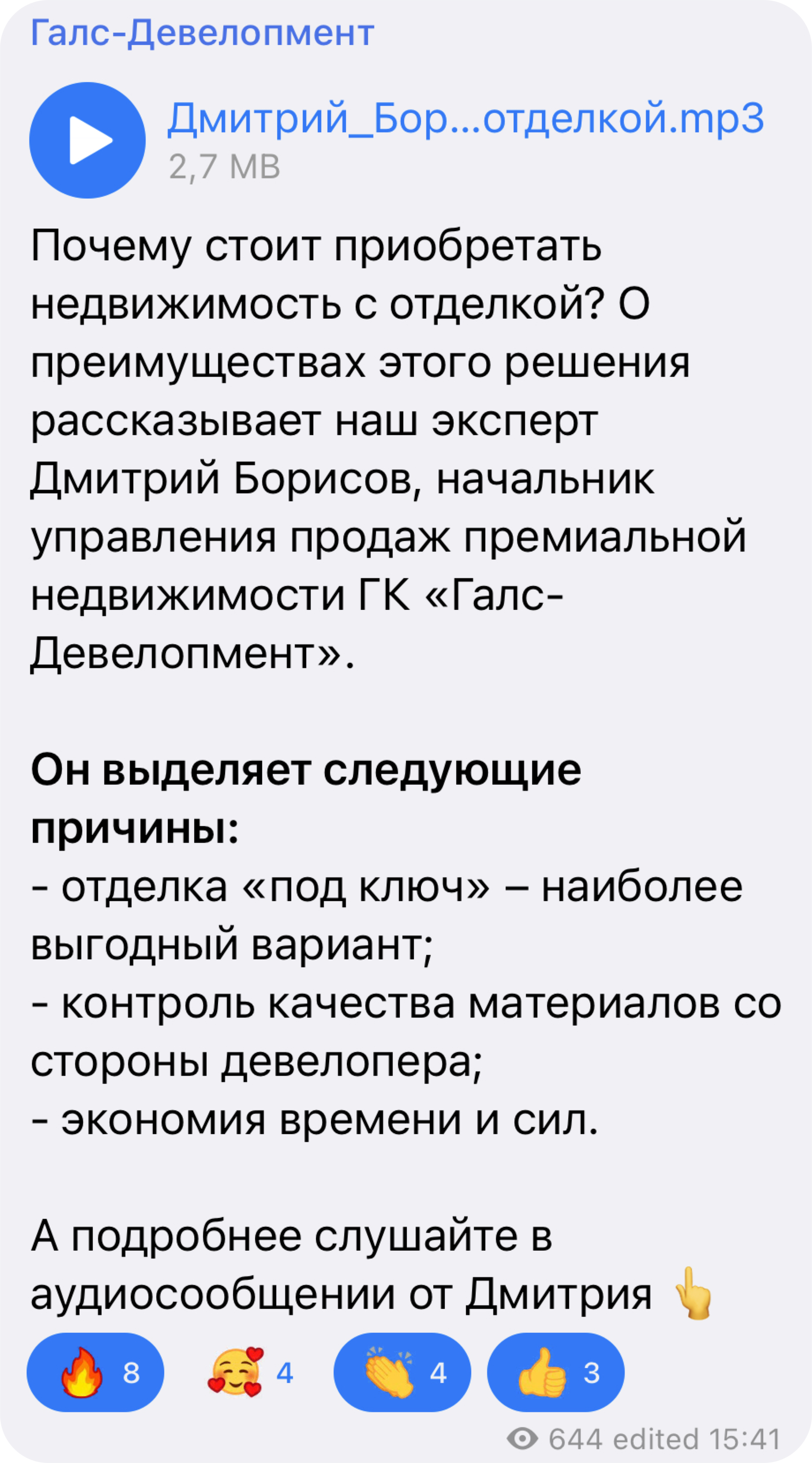 Пример формата аудиосообщений в телеграм-канале «Галс-Девелопмент»