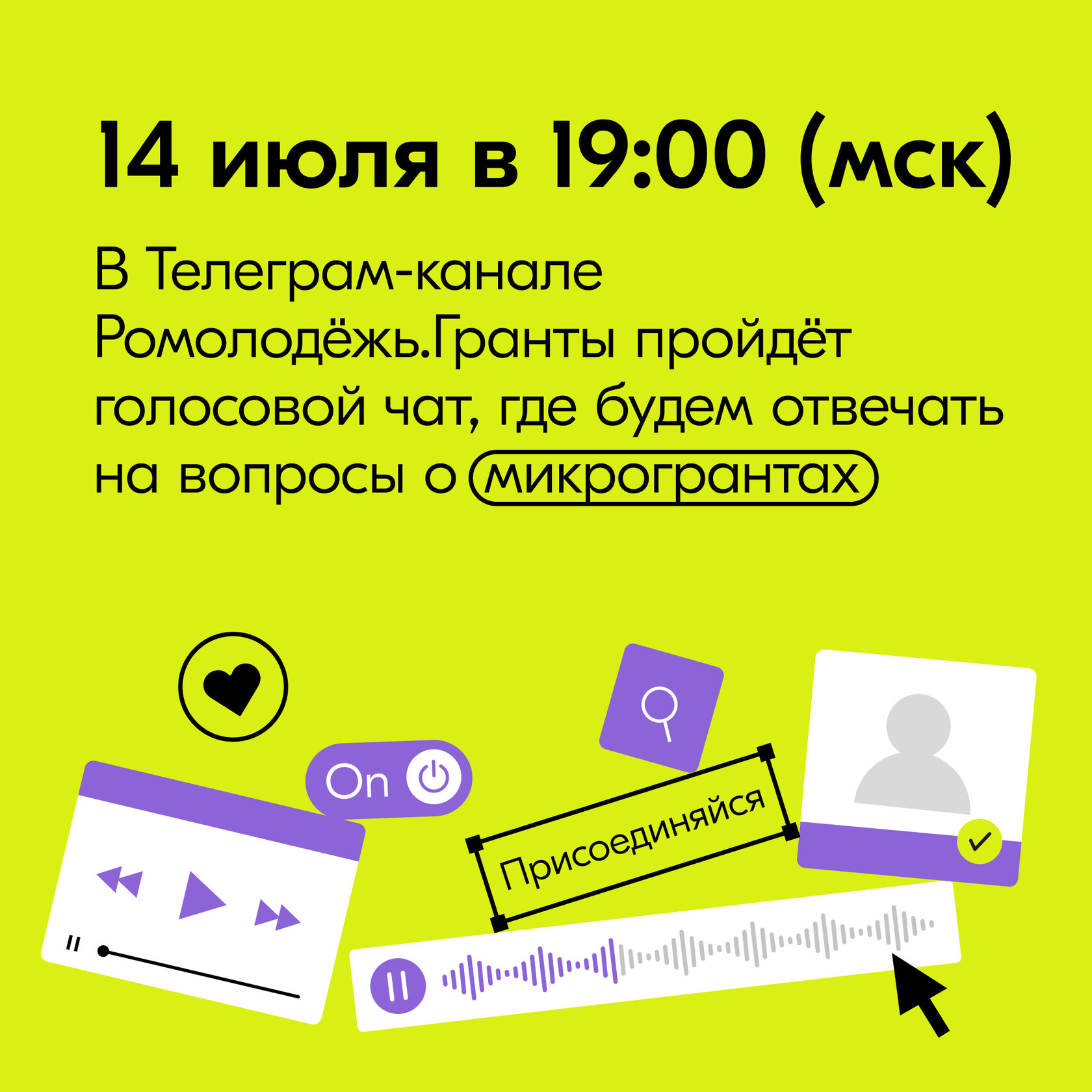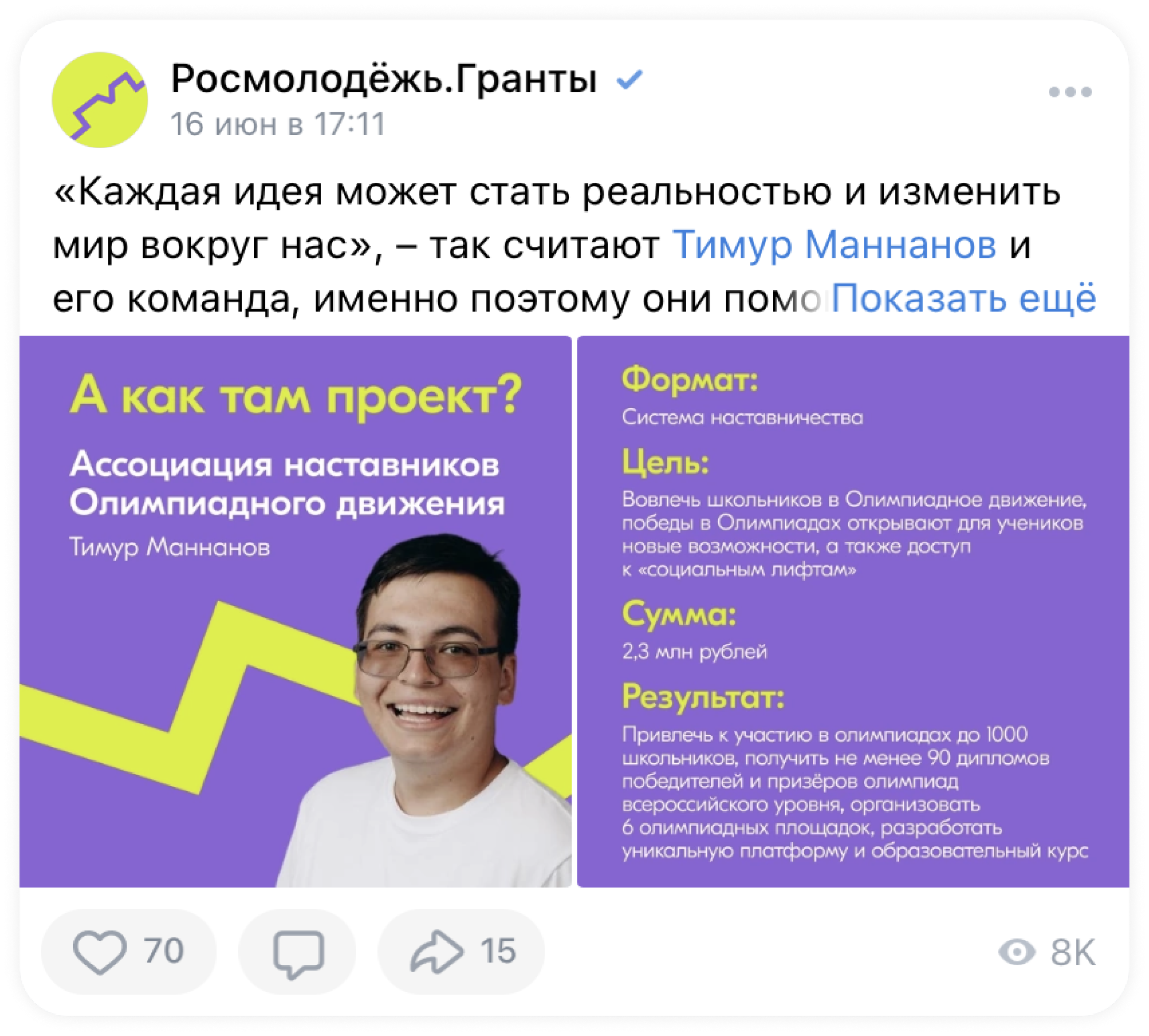 Мы начали разработку коммуникационного плана и определили основную идею: «Вы мечтаете сделать мир лучше. Мы превращаем ваши мечты в возможности». Необходимо было донести до подписчиков сообщества ВКонтакте и Telegram-канала, что Росмолодёжь.Гранты – это платформа, с помощью которой каждый может реализовать себя и свои идеи. Для этого в рамках концепции нам было необходимо:
